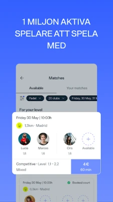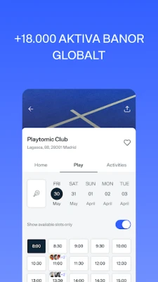 Arrangera din ideala padelmatch med oöverträffad enkelhet. Skapa privata möten på din föredragna anläggning eller öppna upp dem för att bjuda in fler spelare till spontana matcher. Du har fullständig kontroll över hur du vill spela, och kan även ansluta dig till redan aktiva matcher. Med tillgång till Playtomics omfattande nätverk av över 18 000 padelbanor världen över – både inomhus och utomhus – garanteras du alltid en bana som matchar dina behov. Flexibla betalningsalternativ låter dig antingen stå för hela kostnaden eller enkelt dela den med dina medspelare. Utöver detta bjuder Playtomic in dig till spännande ligor och turneringar. Här kan du utmana dig själv, förbättra din ranking, upptäcka nya klubbar och träffa andra padelälskare, allt medan du lyfter ditt spel till nya nivåer.